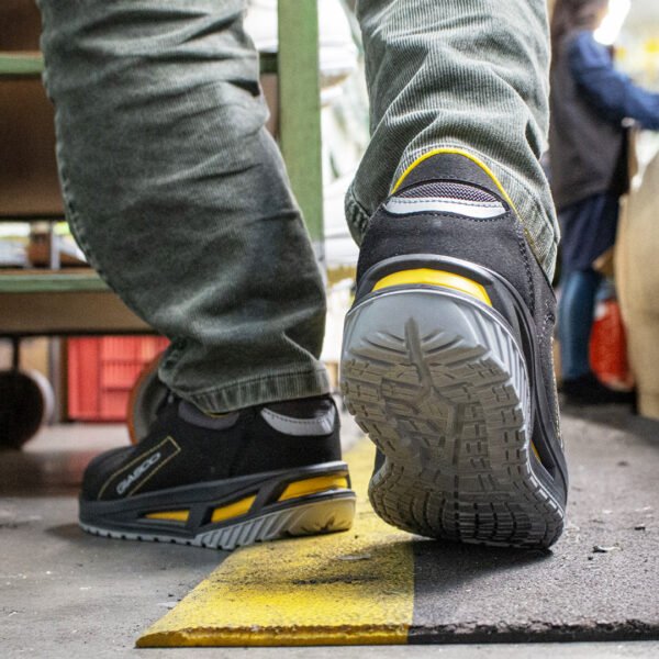 Scarpa antinfortunistica bassa, in pelle groppone scamosciato WRU spessore 1,8-2,0 mm. Fodera in tessuto altamente traspirante e resistente all' abrasione. Calzatura con inserto in tessuto rifrangente. Linguetta morbida, foderata e imbottita. CALZATURA INTERAMENTE SENZA PARTI METALLICHE PUNTALE 200J composito a base polimerica atermico a norma EN 12568 LAMINA tessuto composito antiperforazione flessibile a norma EN 12568 SUOLA KUBE poliuretano bidensità antistatica, resistente all' idrolisi ISO 5423:92, agli idrocarburi e all' abrasione, antishock e antiscivolo SRC SOLETTA 5000 trimaterial extracomfort, traspirante, estraibile, anatomica, assorbente, ESD ed antibatterica La calzatura soddisfa il requisito in accordo con IEC 61340-4-3:2017 (IEC 61340-5-1:2016) per la resistenza elettrica ESD Taglia 36-47 Peso scarpa Tg 42 gr. 550
