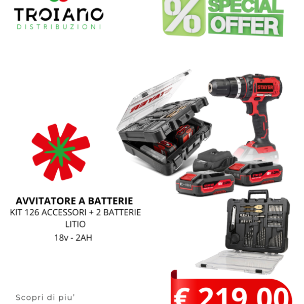 TRAPANO AVVITATORE STAYER VALIGETTA CON 126 ACCESSORI N° 2 BATTERIE + CARICABATTERIE